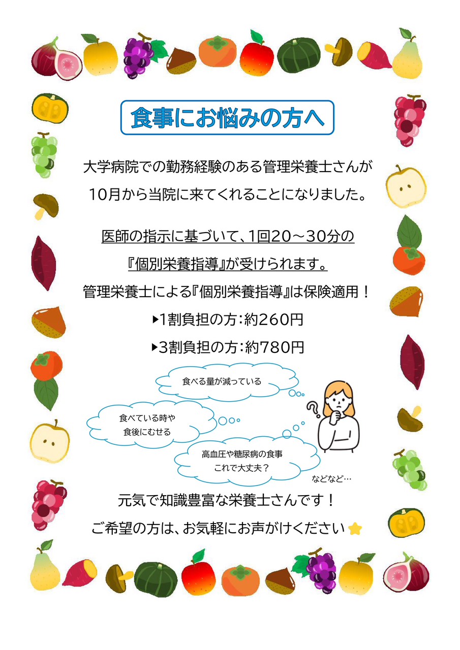 10月より管理栄養士さんが非常勤で月に4-5日程度、当院へ出勤して下さる事になりました。
